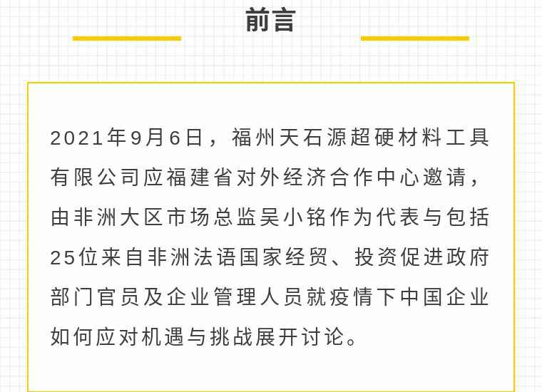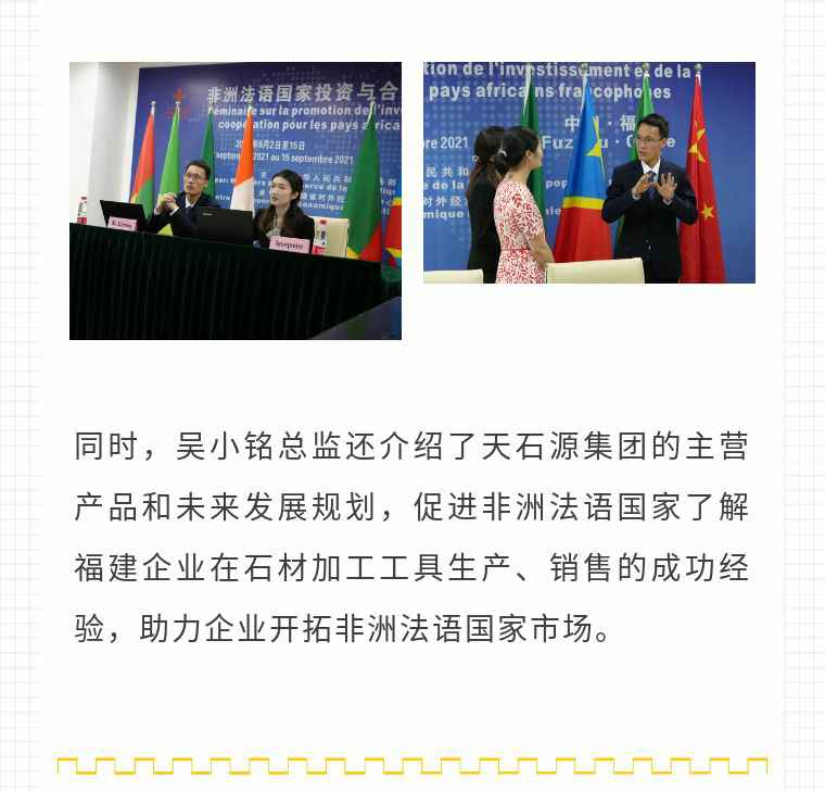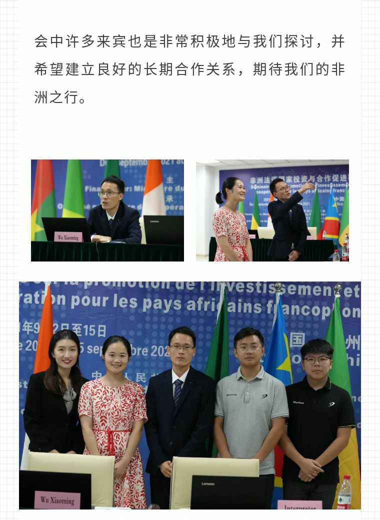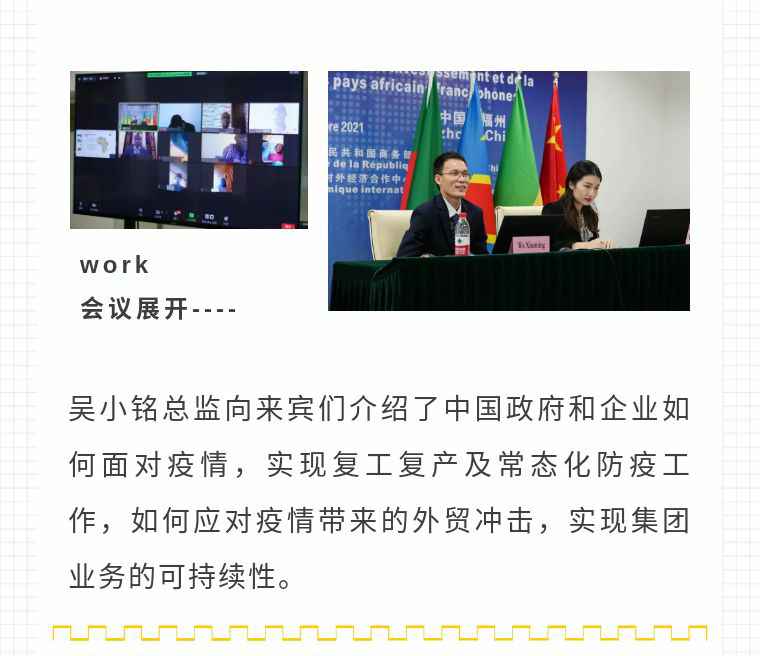 2021年9月6日,星空网页版在线登入-星空(中国)应福建省对外经济合作中心邀请,由非洲大区市场总监吴小铭作为代表与包括25位来自非洲法语国家经贸、投资促进政府部门官员及企业管理人员就疫情下中国企业如何应对机遇与挑战展开讨论。